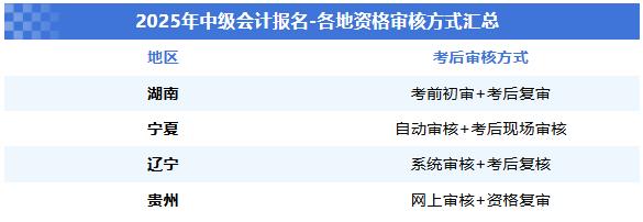 另外,宁夏,湖南,辽宁和贵州地区在2025年中级会计报名简章中,明确:实行报考人员报考前自我资格初审、考试成绩及合格标准公布后资格复审。